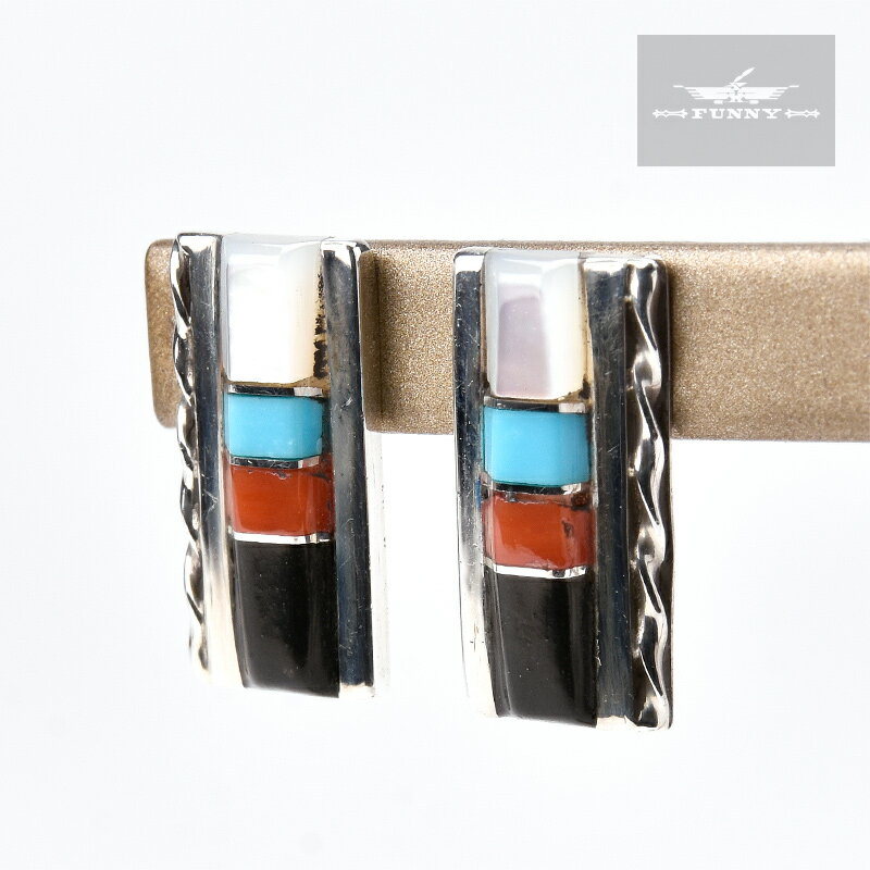 部族 ZUNI(ズニ) 品名 EARRING(イヤリング[ピアス]) 素材スターリングシルバー(925/1000) 石ターコイズオニキスコーラルシェル サイズW7 × H15(mm) ●ご使用のブラウザによっては色の見え方が若干異なる場合がございます。